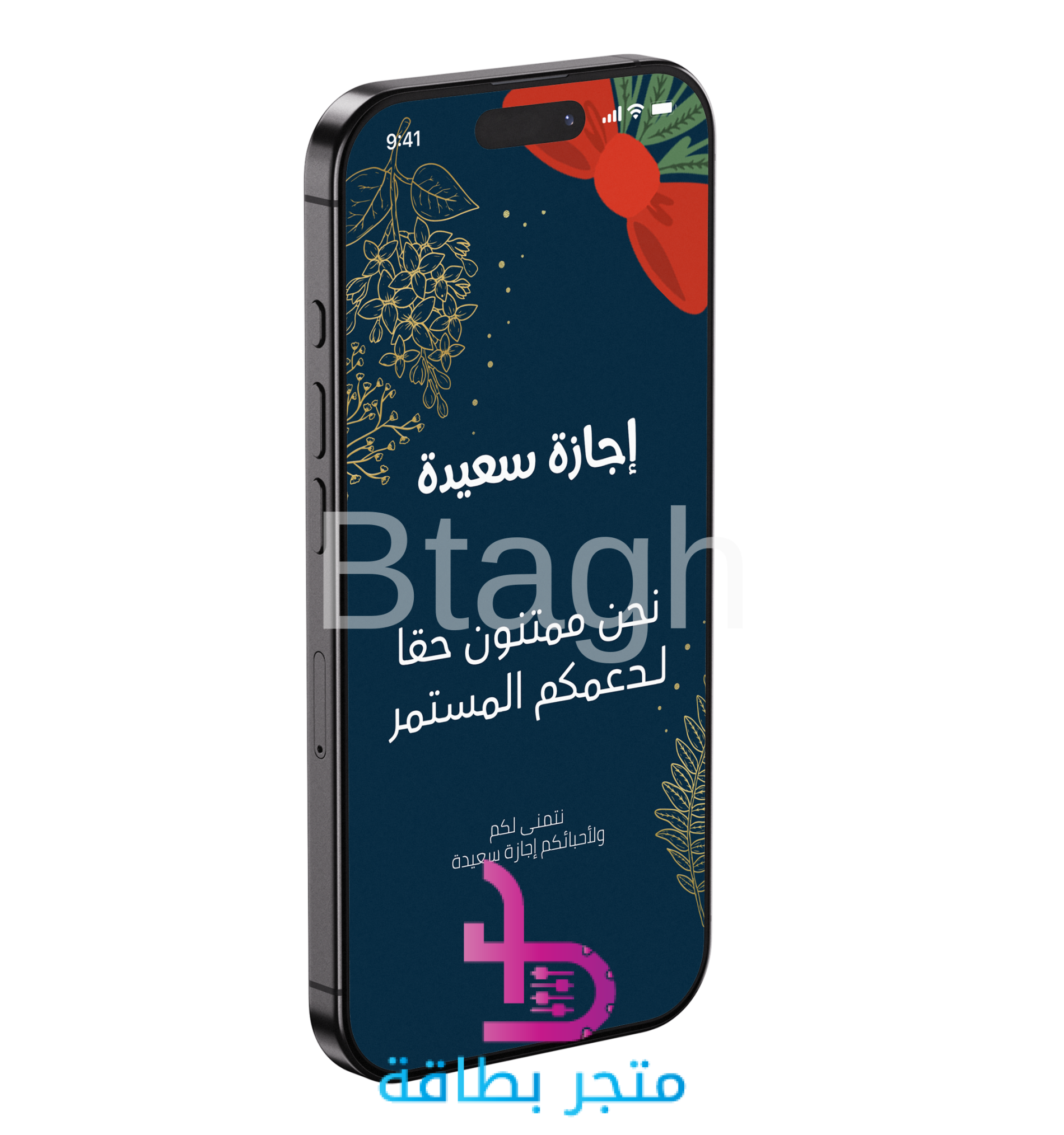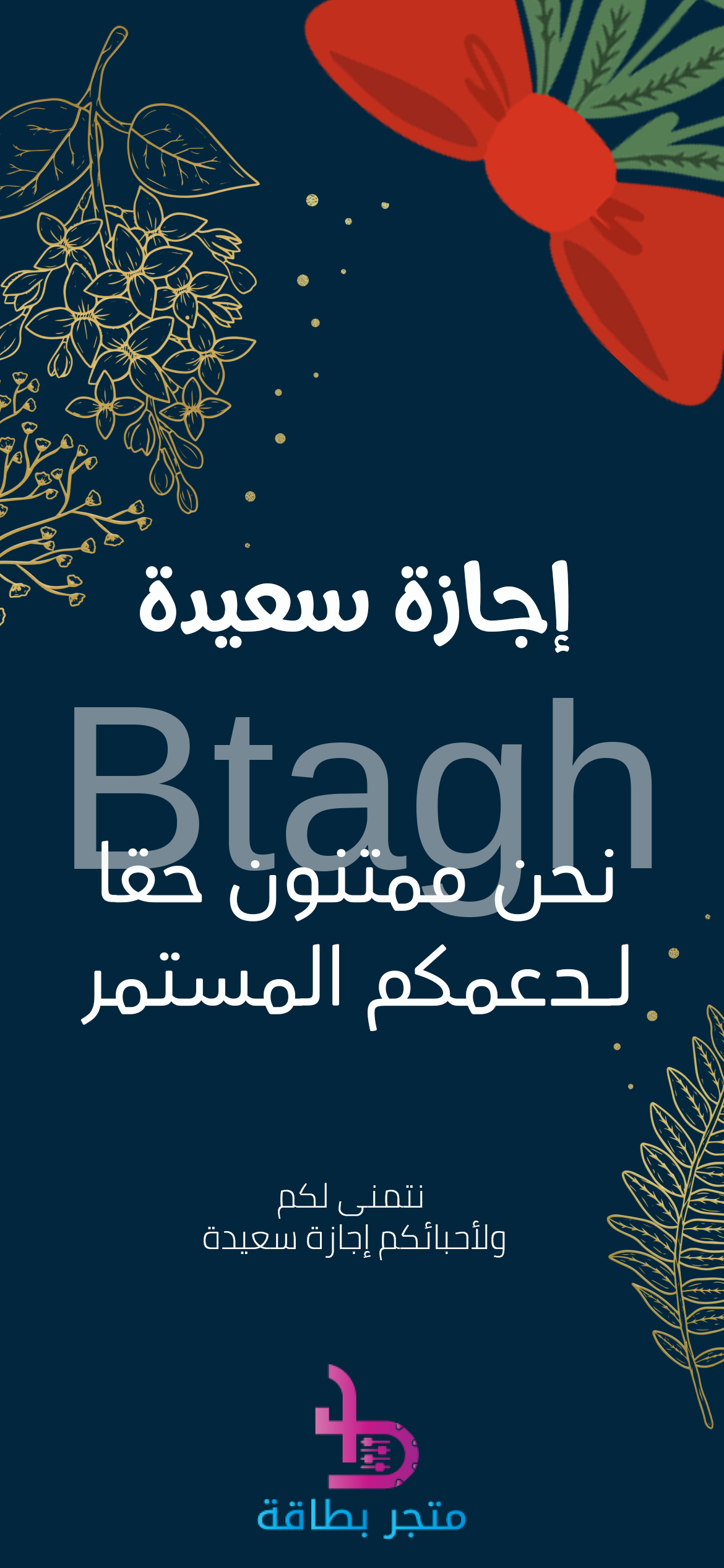 بطاقة رقمية احترافية ودافئة مصممة خصيصاً لتهنئة العملاء أو الزملاء بمناسبة الإجازات. تتميز بخلفية زرقاء داكنة (كحلي) تضفي طابعاً رسمياً، مع رسومات نباتية أنيقة باللون الذهبي وشريط أحمر يرمز للهدايا والاحتفالات. تحمل البطاقة عبارة “إجازة سعيدة” و “نحن ممتنون حقاً لدعمكم المستمر” بخط عربي أبيض واضح، مع تذييل بعبارة “نتمنى لكم ولأحبائكم إجازة سعيدة”. هذا التصميم مثالي للمشاركة عبر البريد الإلكتروني أو وسائل التواصل الاجتماعي، معبراً عن الشكر والتقدير بأسلوب راقٍ.