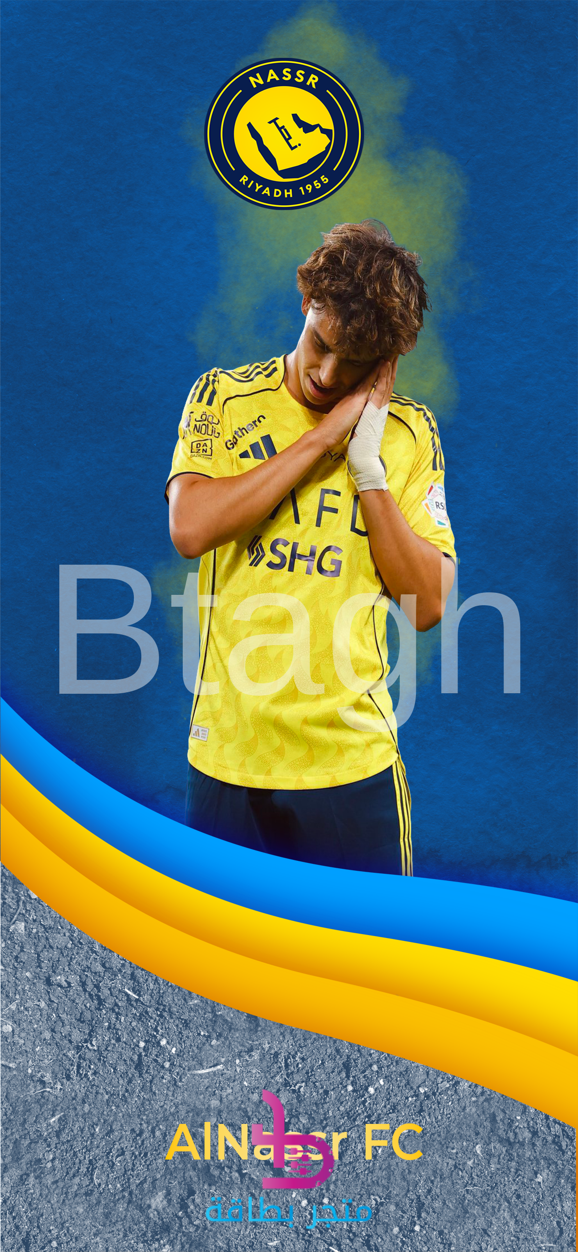 خلفية رقمية ديناميكية وحماسية لنادي النصر السعودي، تتميز بصورة اللاعب جواو فيليكس وهو يؤدي احتفالية “النوم” الشهيرة بعد تسجيل هدف. يغلب على التصميم مزيج من الألوان الأزرق والأصفر مع تأثيرات دخانية في الخلفية، وشريطين متموجين بألوان النادي في الأسفل، مما يمنحها طابعاً حيوياً ومثيراً. يظهر شعار النادي في الأعلى بشكل واضح. تصميم مثالي لمشجعي النصر الذين يفضلون الخلفيات التي تركز على نجوم الفريق واحتفالاتهم المميزة.