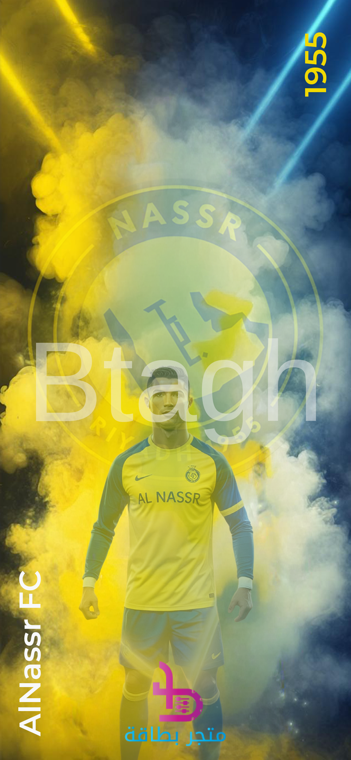 خلفية رقمية قوية ومثيرة لنادي النصر السعودي، تتميز بصورة النجم العالمي كريستيانو رونالدو وهو يقف بثقة بقميص النادي. يغلب على التصميم تأثير الدخان الكثيف بألوان النادي الأصفر والأزرق، مما يمنحها طابعاً حماسياً وجريئاً. يظهر شعار النادي وسنة التأسيس (1955) بشكل خافت في الخلفية، مما يجعلها خلفية مثالية لمشجعي النصر الذين يفضلون التصاميم الدرامية والمليئة بالحركة.