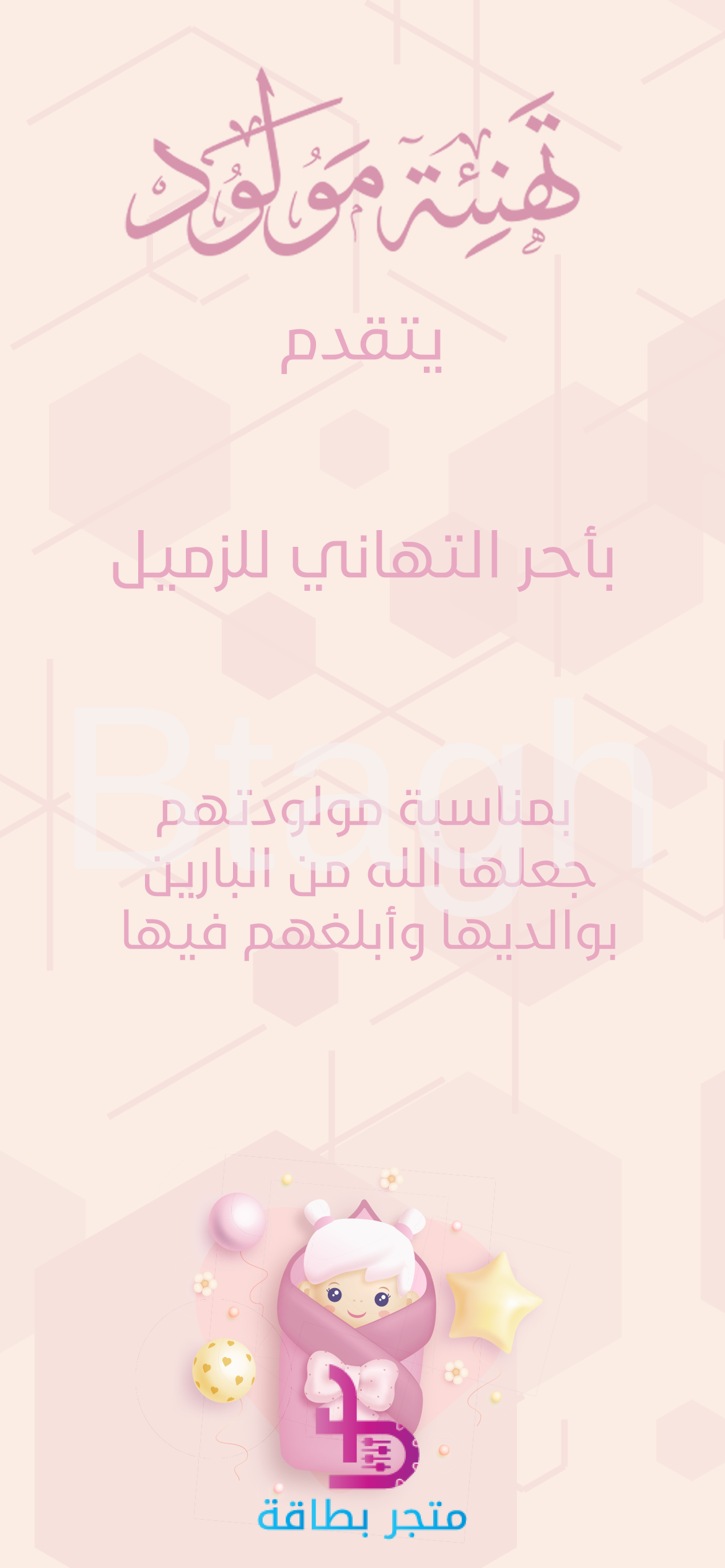 بطاقة تهنئة رقمية رسمية ومهنية بمناسبة قدوم مولود جديد، مصممة بخلفية وردية باهتة ذات طابع هندسي ناعم. تتصدرها عبارة “تهنئة مولود” بخط عربي أنيق، وتتضمن رسالة رسمية: “يتقدم بأحر التهاني للزميل بمناسبة مولودتهم، جعلها الله من البارين بوالديها وأبلغهم فيها”. يظهر في الأسفل رسوم كرتونية لطفل ملفوف في قماط وردي. تصميم مثالي لإرسال تهنئة رسمية ومهنية لزميل أو صديق عمل بمناسبة المولودة الجديدة.