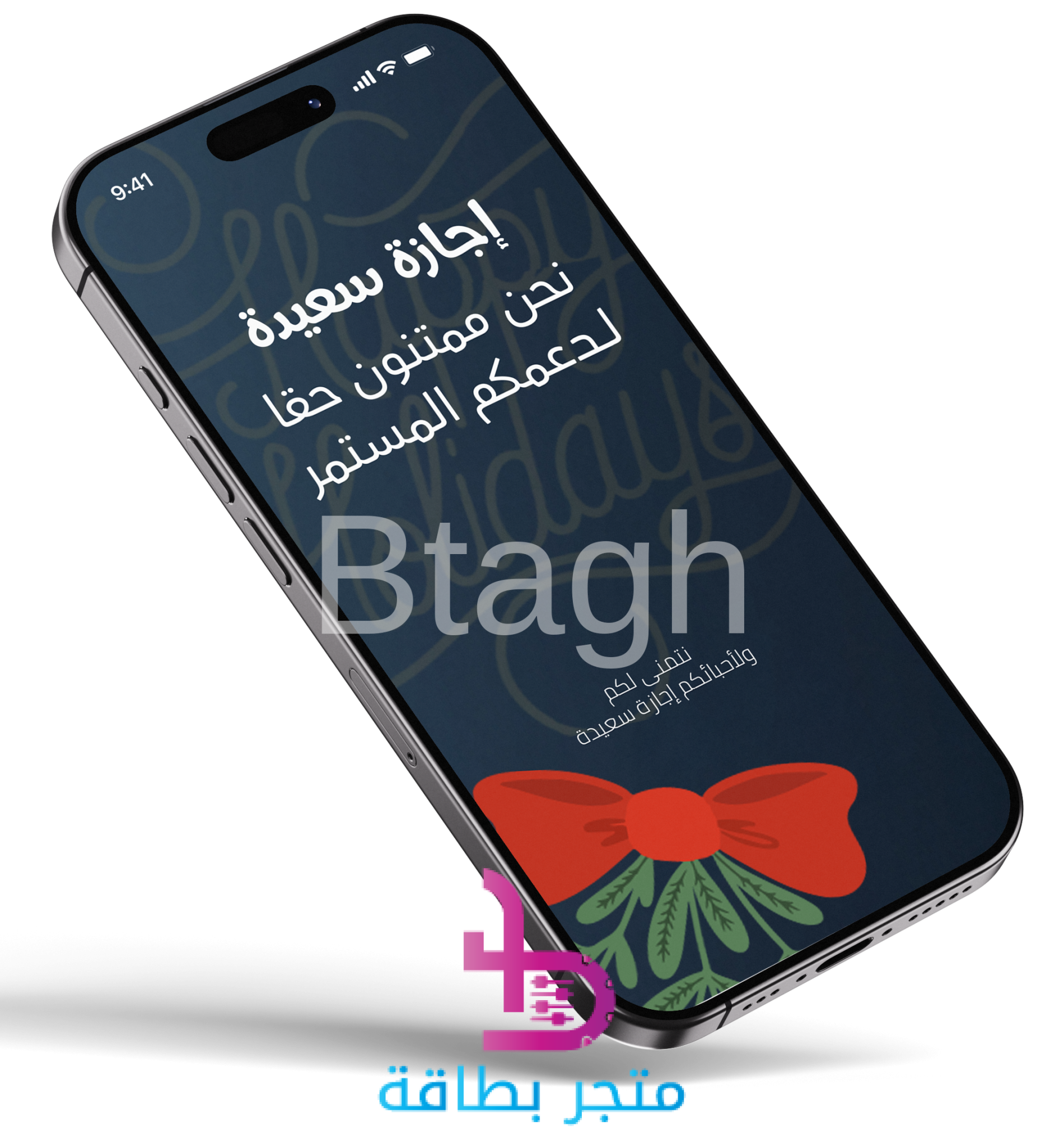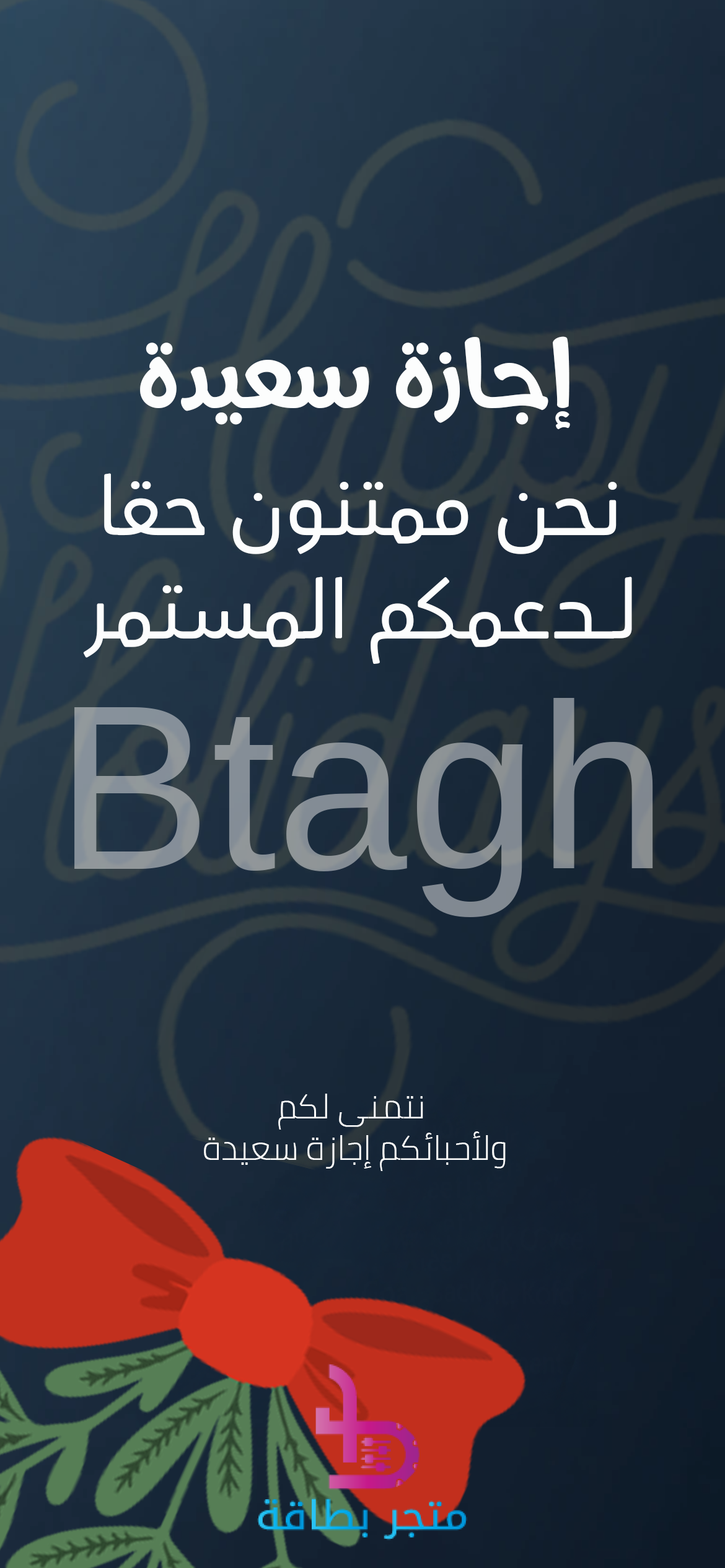 بطاقة رقمية احترافية ودافئة مصممة خصيصاً لتهنئة العملاء أو الزملاء بمناسبة الإجازات. تتميز بخلفية زرقاء داكنة (كحلي) مع نقوش خفية لكلمة “Happy Holidays” بالإنجليزية، مما يضفي طابعاً عصرياً. يبرز في الجزء السفلي شريط أحمر كبير مع رسومات نباتية خضراء، يرمز للهدايا والاحتفالات. تحمل البطاقة عبارة “إجازة سعيدة” و “نحن ممتنون حقاً لدعمكم المستمر” بخط عربي أبيض واضح، مع تذييل بعبارة “نتمنى لكم ولأحبائكم إجازة سعيدة”. هذا التصميم مثالي للمشاركة عبر البريد الإلكتروني أو وسائل التواصل الاجتماعي، معبراً عن الشكر والتقدير بأسلوب راقٍ.