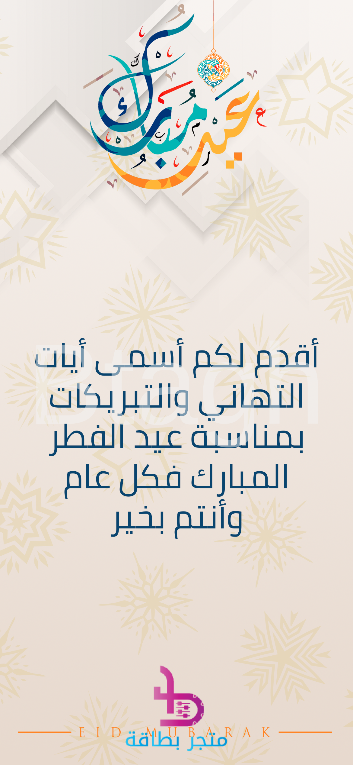 بطاقة تهنئة رقمية عصرية ومشرقة، مصممة بخلفية فاتحة وهادئة مزينة بزخارف نجمية خفيفة. تتوسطها عبارة “عيد مبارك” بخط عربي ملون ومبهج، وتنقل أسمى آيات التهاني والتبريكات بمناسبة عيد الفطر المبارك. تصميم يجمع بين الرقي والبهجة، مثالي لمشاركة الفرحة والتهاني الراقية مع الأهل والأصدقاء والزملاء، مع تمنيات بـ “كل عام وأنتم بخير”.