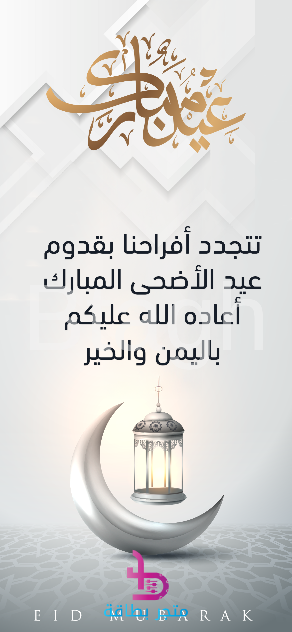 بطاقة تهنئة رقمية ذات طابع نقي وراقي، مصممة بخلفية بيضاء عصرية مع خط عربي مذهب لعبارة “عيد مبارك”. يزينها هلال وفانوس فضيان، وتنقل رسالة تهنئة معبرة عن الفرح بقدوم العيد: “تتجدد أفراحنا بقدوم عيد الأضحى المبارك”، مع دعاء بـ “أعاده الله عليكم باليمن والخير”. تصميم يجمع بين البساطة والفخامة.