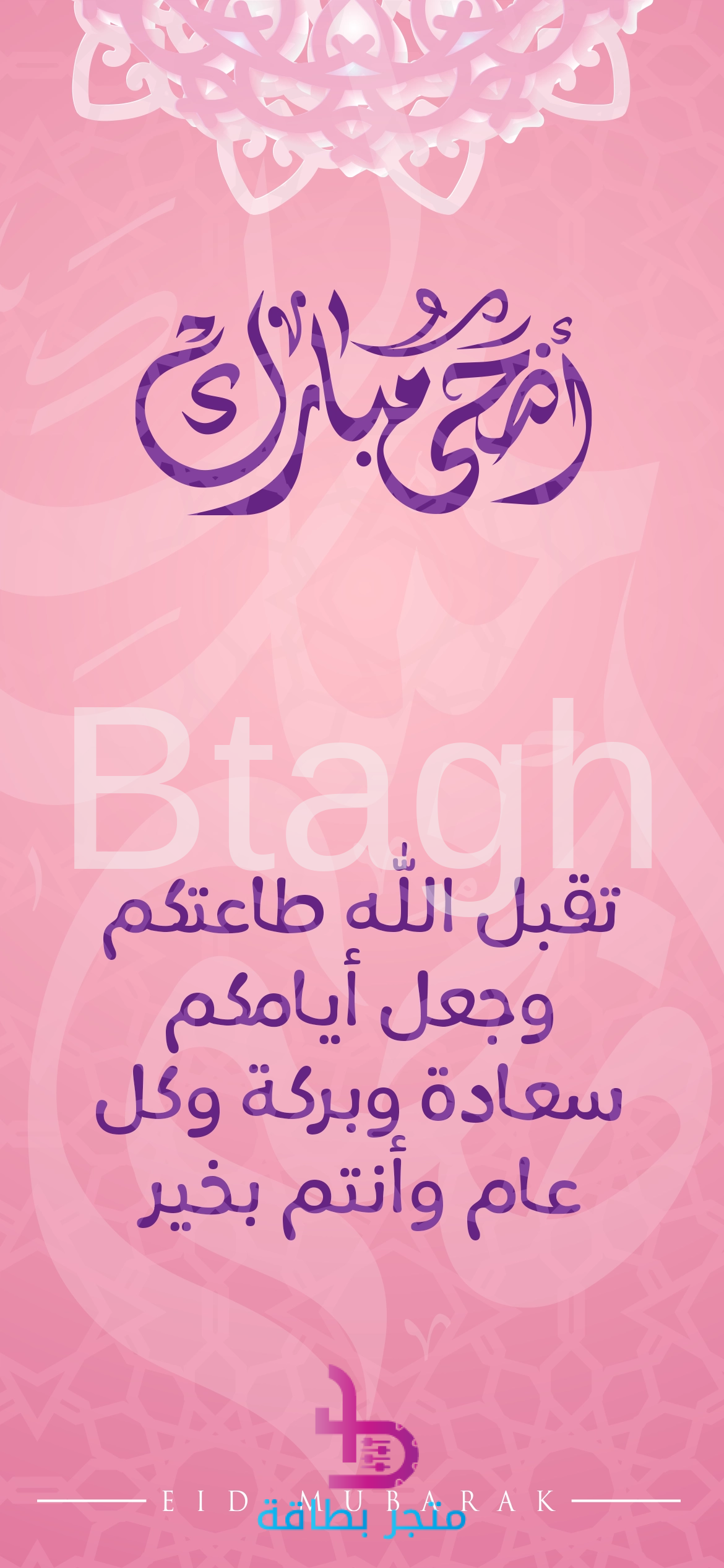بطاقة تهنئة رقمية ذات طابع مبهج ودافئ، مصممة بخلفية متدرجة باللون الوردي والبنفسجي، مع زخرفة إسلامية خفيفة. تتوسطها عبارة “أضحى مبارك” بخط عربي أنيق باللون البنفسجي، وتنقل رسالة تهنئة ودعاء بـ “تقبل الله طاعتكم وجعل أيامكم سعادة وبركة”، مما يجعلها خياراً مثالياً لإرسال تهانٍ ودية ومحبة بمناسبة عيد الأضحى المبارك.