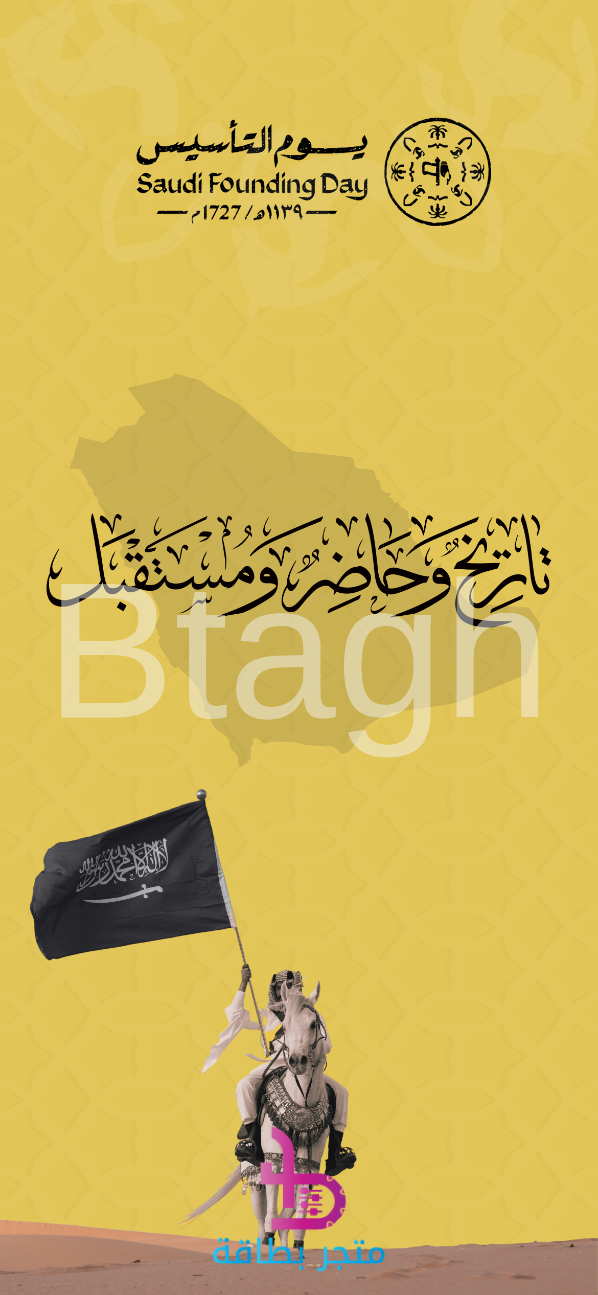 بطاقة رقمية تاريخية ورمزية مصممة خصيصاً للاحتفال بيوم التأسيس السعودي. تتميز بخلفية صفراء/ذهبية ساطعة ترمز للصحراء، تتوسطها خريطة المملكة بشكل خفي. يبرز في الجزء العلوي شعار يوم التأسيس، وفي الوسط عبارة “تاريخ وحاضر ومستقبل” بخط عربي أسود أنيق. يظهر في الجزء السفلي فارس يمتطي حصاناً ويحمل راية سوداء، مما يجسد القوة والفروسية وعمق التاريخ. هذا التصميم مثالي للمشاركة عبر وسائل التواصل الاجتماعي أو كخلفية للهاتف، معبراً عن الاعتزاز بالجذور التاريخية للمملكة والتطلع للمستقبل.