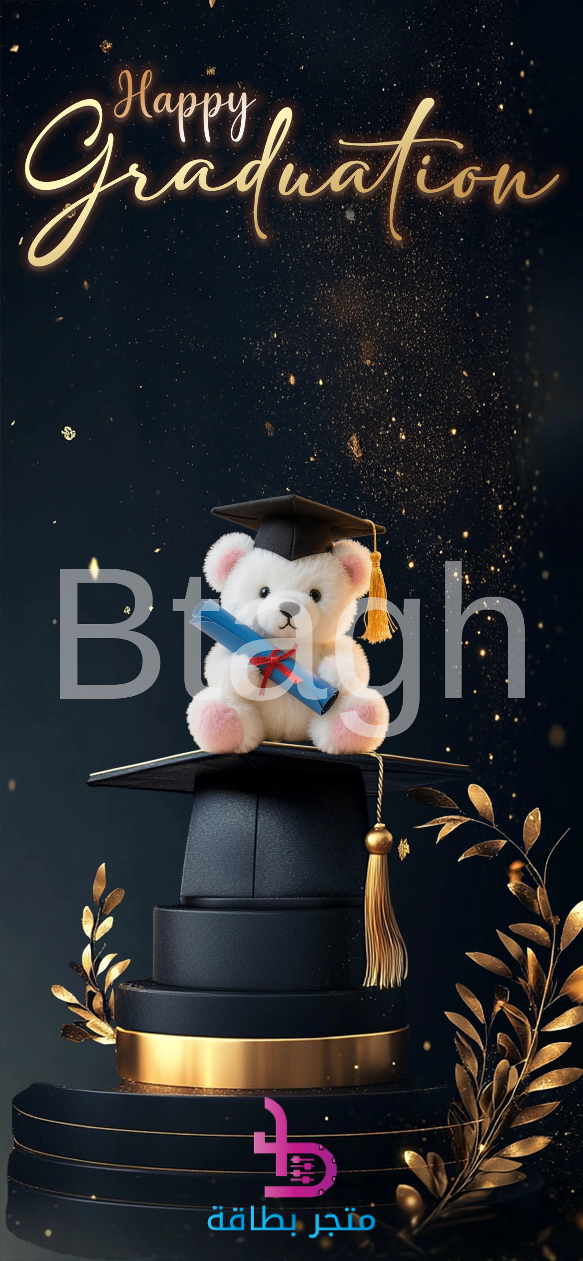 بطاقة رقمية تهنئة فاخرة ولطيفة بالتخرج، مصممة بطابع يجمع بين الأناقة والفرح. تتميز بخلفية داكنة عميقة مع تأثيرات إضاءة ذهبية متلألئة. يظهر في الوسط دب أبيض لطيف يرتدي قبعة التخرج ويحمل شهادة ملفوفة، يجلس على منصة عرض متدرجة باللون الأسود والذهبي، محاطة بأغصان ذهبية. تتضمن البطاقة عبارة Happy Graduation بخط ذهبي أنيق. هذا التصميم مثالي كمنتج رقمي فريد، يمكن استخدامه كخلفية للهاتف، أو للمشاركة عبر وسائل التواصل الاجتماعي، معبراً عن الفرحة بالإنجاز الأكاديمي بأسلوب راقٍ ولطيف.