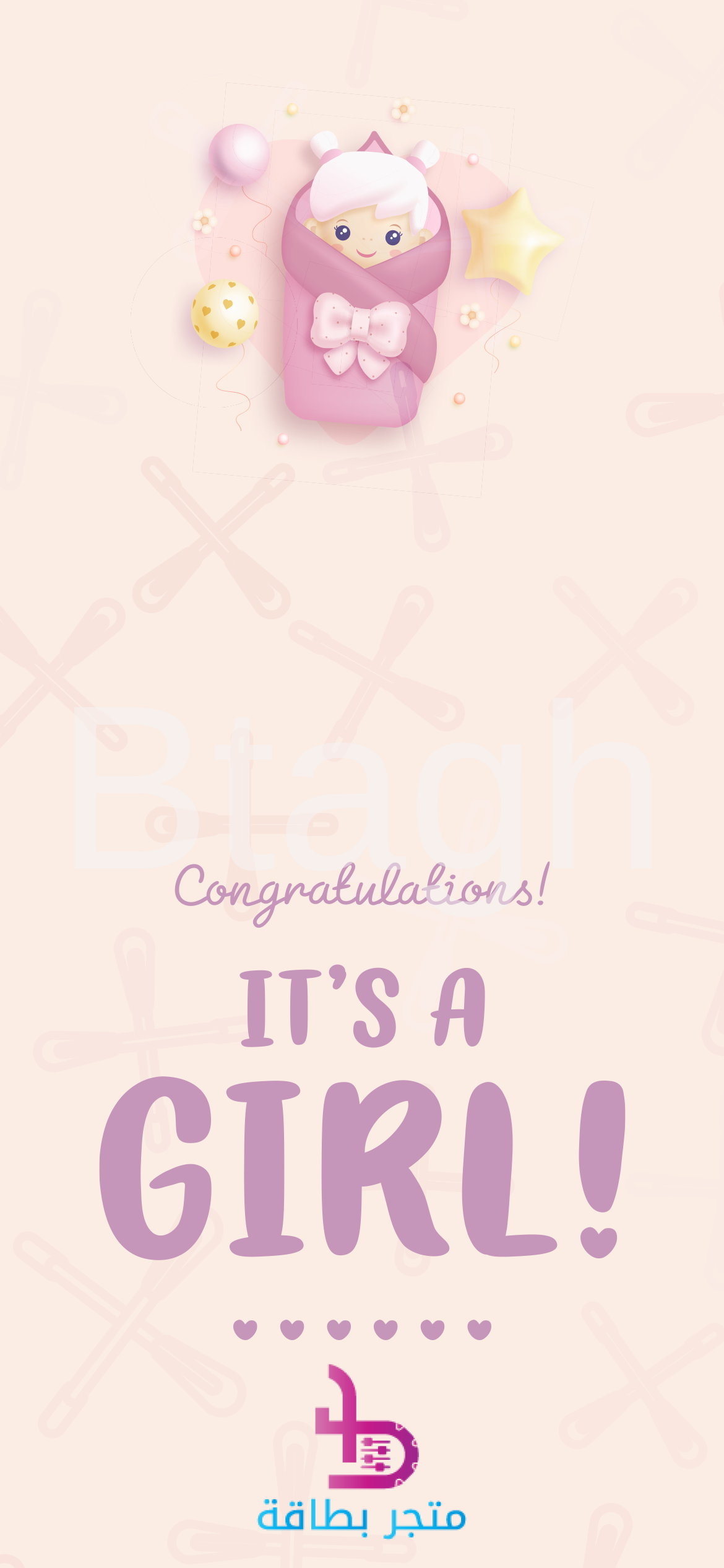 - رسالة إنجليزية: “Congratulations! IT’S A GIRL!” مناسبة للجمهور الدولي.