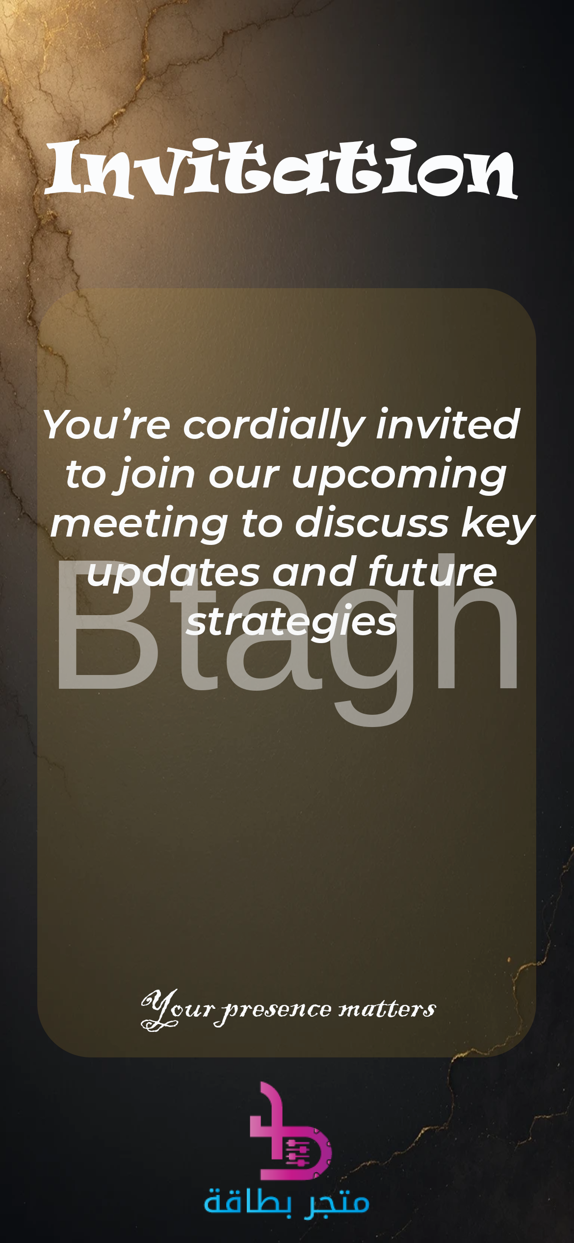 بطاقة دعوة اجتماع عمل فاخرة : بطاقة دعوة رقمية بتصميم أنيق يجمع بين فخامة الرخام الأسود وخطوط الذهب، مثالية لإرسال دعوات رسمية لاجتماعات العمل الهامة. تحمل رسالة واضحة تدعو لمناقشة التحديثات الرئيسية والاستراتيجيات المستقبلية، وتؤكد على أن “حضورك مهم”. خيار مثالي لضمان حضور لافت ومناسب لأهم قرارات العمل.