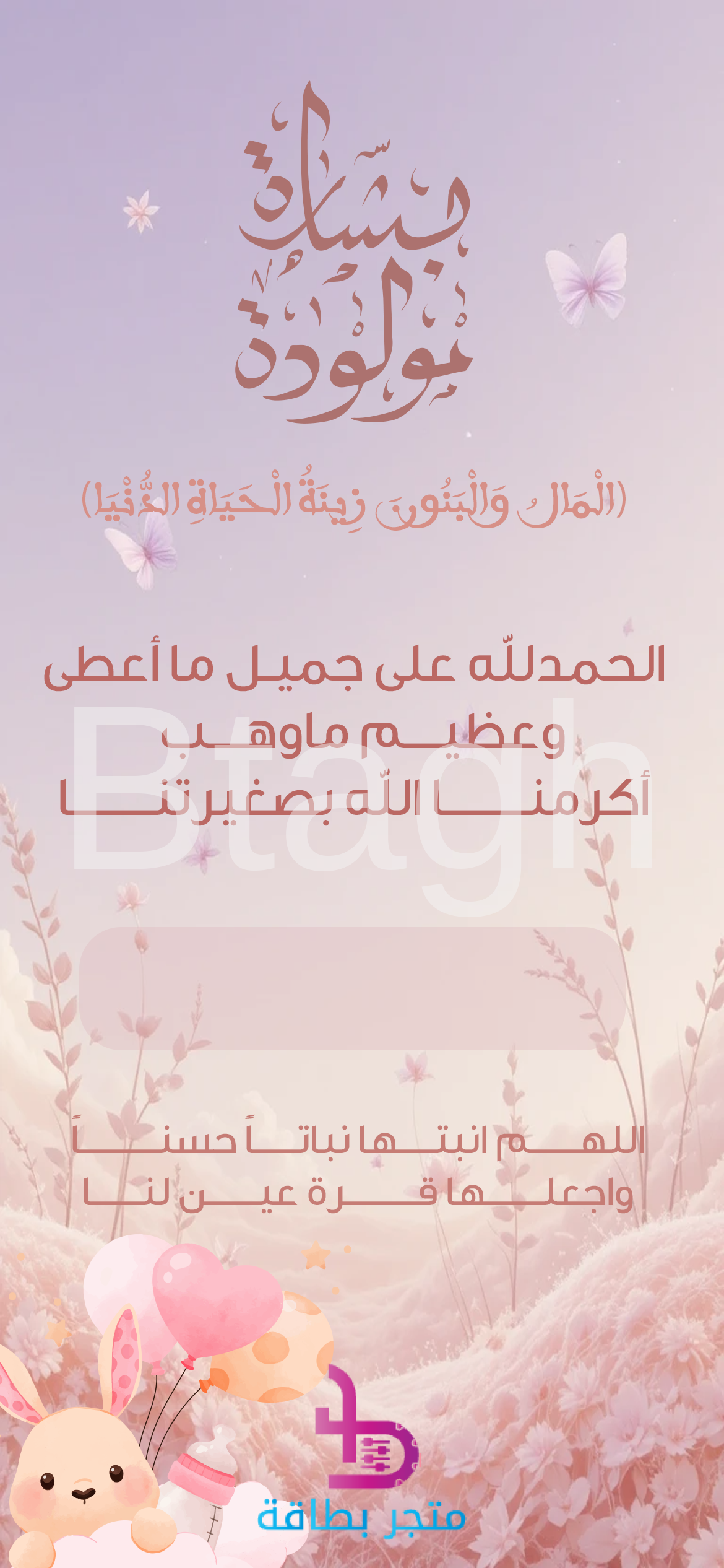 بطاقة تهنئة رقمية رقيقة ولطيفة بمناسبة قدوم مولوده جديده، مصممة بخلفية متدرجة باللون الوردي الباستيلي الهادئ. يغلب على التصميم طابع الحديقة الخيالية مع رسومات نباتية ناعمة، وتظهر في الأسفل شخصية أرنب كرتوني لطيف يحمل بالونات وقلوب. تتصدرها عبارة “بشارة مولودة” بخط عربي أنيق، وتتضمن آيات قرآنية وأدعية مباركة مثل “المال والبنون زينة الحياة الدنيا” و “اللهم أنبتها نباتاً حسناً واجعلها قرة عين لنا”. تصميم مثالي لمشاركة فرحة المولودة الجديدة بأسلوب طفولي ودافئ.