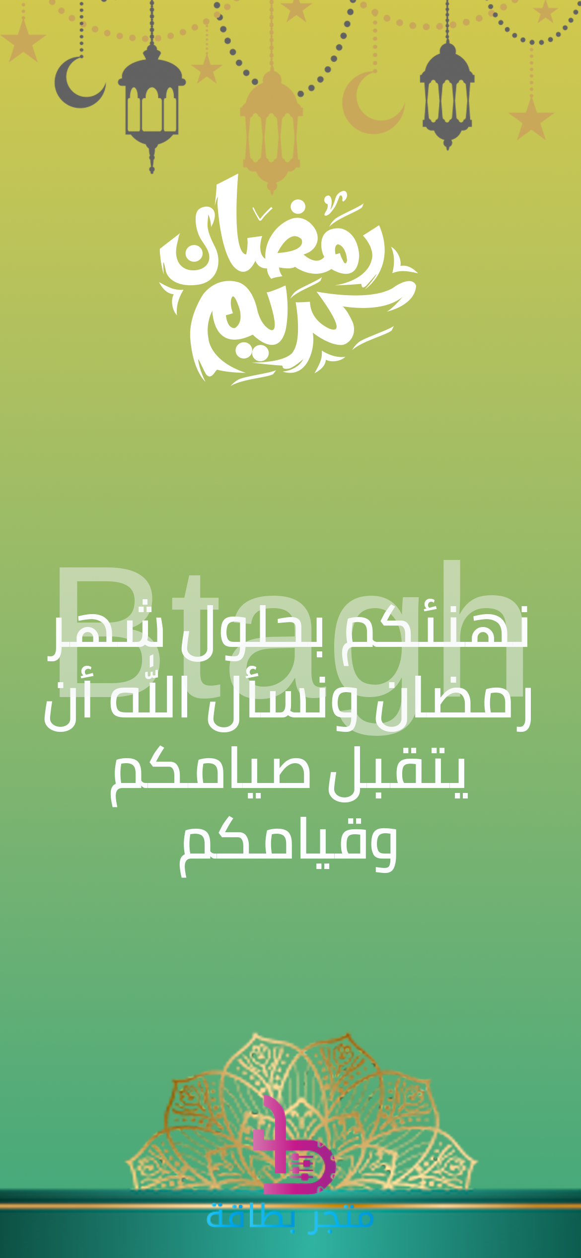 بطاقة تهنئة رقمية أنيقة بتصميم إسلامي تقليدي، مثالية لتهنئة الأهل والأصدقاء والعملاء بحلول شهر رمضان المبارك. تتميز بخلفية متدرجة باللون الأخضر الهادئ وزخارف الفوانيس والخط العربي الأصيل لعبارة “رمضان كريم”. تحمل رسالة دعاء خالصة “نسأل الله أن يتقبل صيامكم وقيامكم”، مما يجعلها وسيلة مثالية للتعبير عن التمنيات الطيبة في هذا الشهر الفضيل.