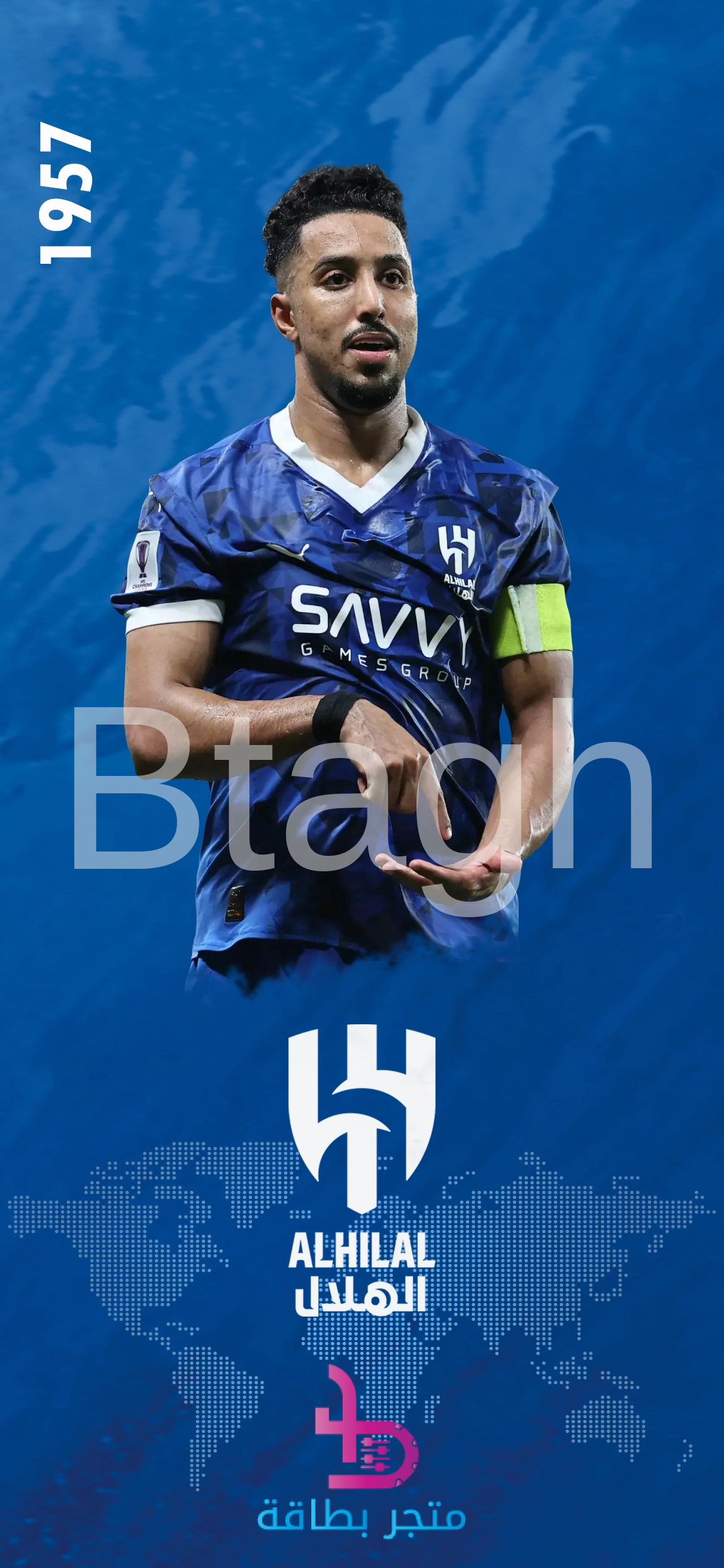 بطاقة رقمية رياضية حصرية لنادي الهلال السعودي، مصممة خصيصاً لمتجر البطاقات الرقمية. تتميز بخلفية زرقاء ساطعة مع تأثيرات مائية خفيفة في الجزء العلوي، وخلفية خريطة عالمية منقطة في الجزء السفلي ترمز إلى العالمية. يبرز في الجزء العلوي سنة التأسيس “1957”، وفي الوسط صورة للاعب (سالم الدوسري) بقميص الفريق وهو يشير إلى الأسفل، في إشارة إلى القوة والتركيز. يظهر شعار النادي واسمه باللغتين العربية والإنجليزية في الجزء السفلي. هذا التصميم مثالي كمنتج رقمي فريد، يمكن استخدامه كخلفية للهاتف، أو للمشاركة عبر وسائل التواصل الاجتماعي، معبراً عن الفخر والانتماء لنادي الهلال.