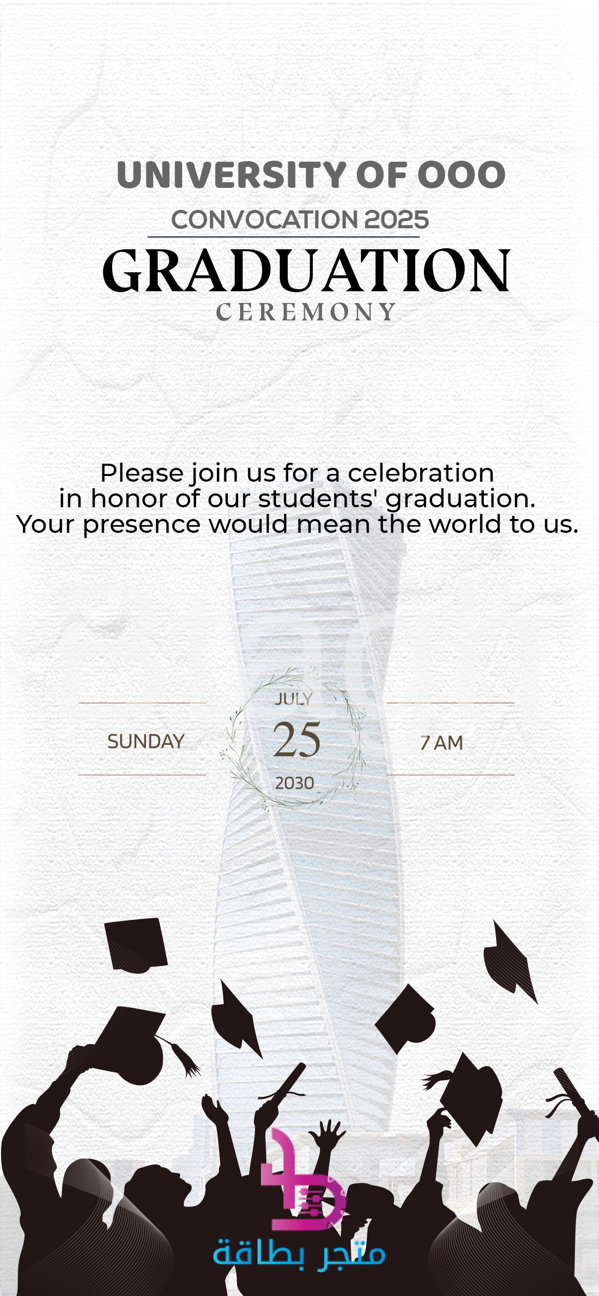 بطاقة رقمية دعوة رسمية لحفل تخرج جامعي، مصممة بطابع عصري وأنيق. تتميز بخلفية بيضاء فاتحة مع نسيج خفيف، مما يمنحها طابعاً رسمياً وراقياً. تتضمن البطاقة عبارة UNIVERSITY OF CONVOCATION GRADUATION CEREMONY ونص دعوة باللغة الإنجليزية. يظهر في الوسط رسم لمبنى شاهق (قد يكون برجاً حديثاً) مزين بإكليل من الغار، وفي الجزء السفلي رسوم ظلية لمجموعة من الخريجين يرمون قبعاتهم. هذا التصميم مثالي كمنتج رقمي فريد، يمكن استخدامه كدعوة إلكترونية للحفل، أو للمشاركة عبر وسائل التواصل الاجتماعي، معبراً عن الفخر بالإنجاز الأكاديمي بأسلوب عالمي.