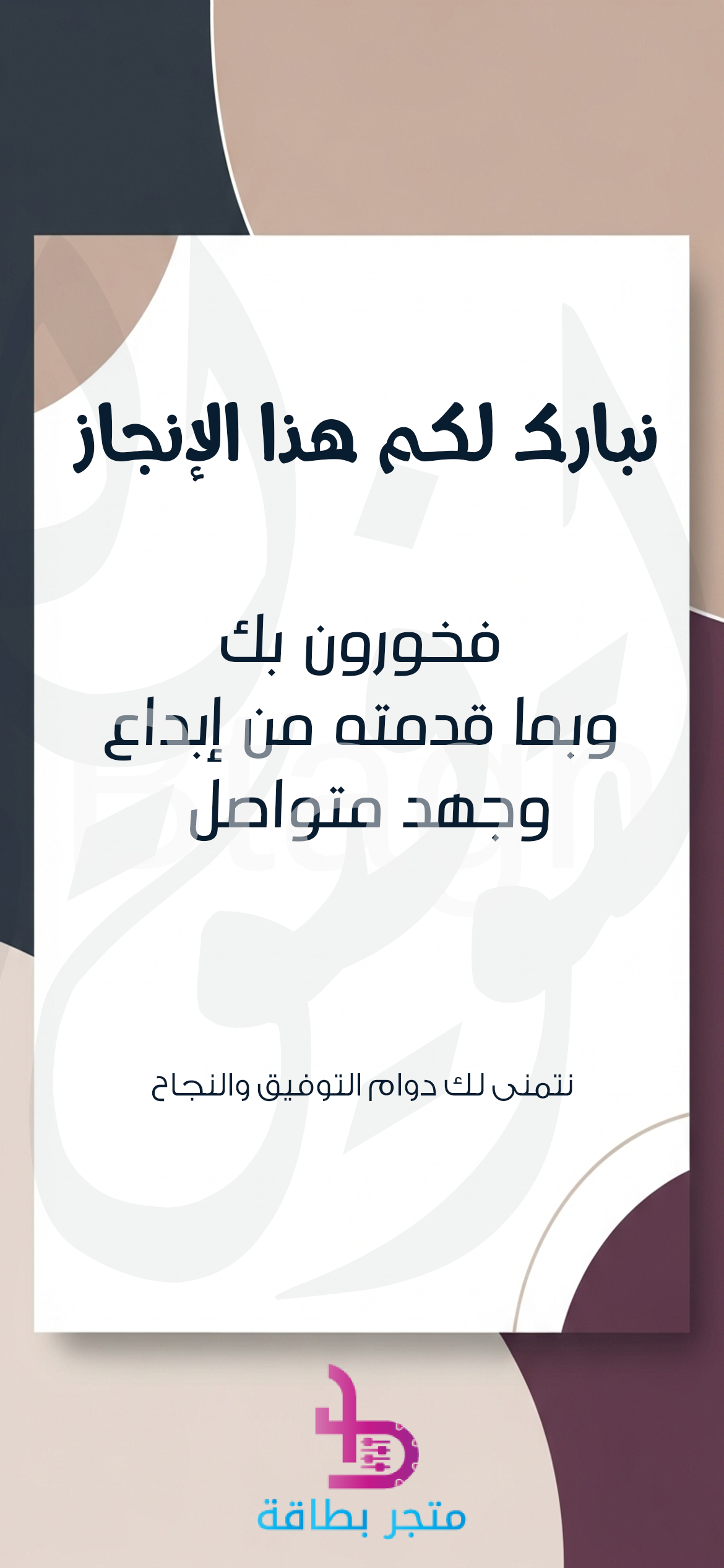 بطاقة نبارك لكم هذا الإنجاز الكلاسيكية تقدير الإبداع والجهد المتواصل: بطاقة شكر وتقدير أنيقة بتصميم كلاسيكي هادئ وألوان ترابية راقية. مثالية للتعبير عن الفخر والاعتزاز بالإنجازات الفردية التي تعكس الإبداع والجهد المتواصل. أرسلها لتقدير موظف، زميل، أو شريك على عمله المتميز، متمنيًا له دوام التوفيق والنجاح.